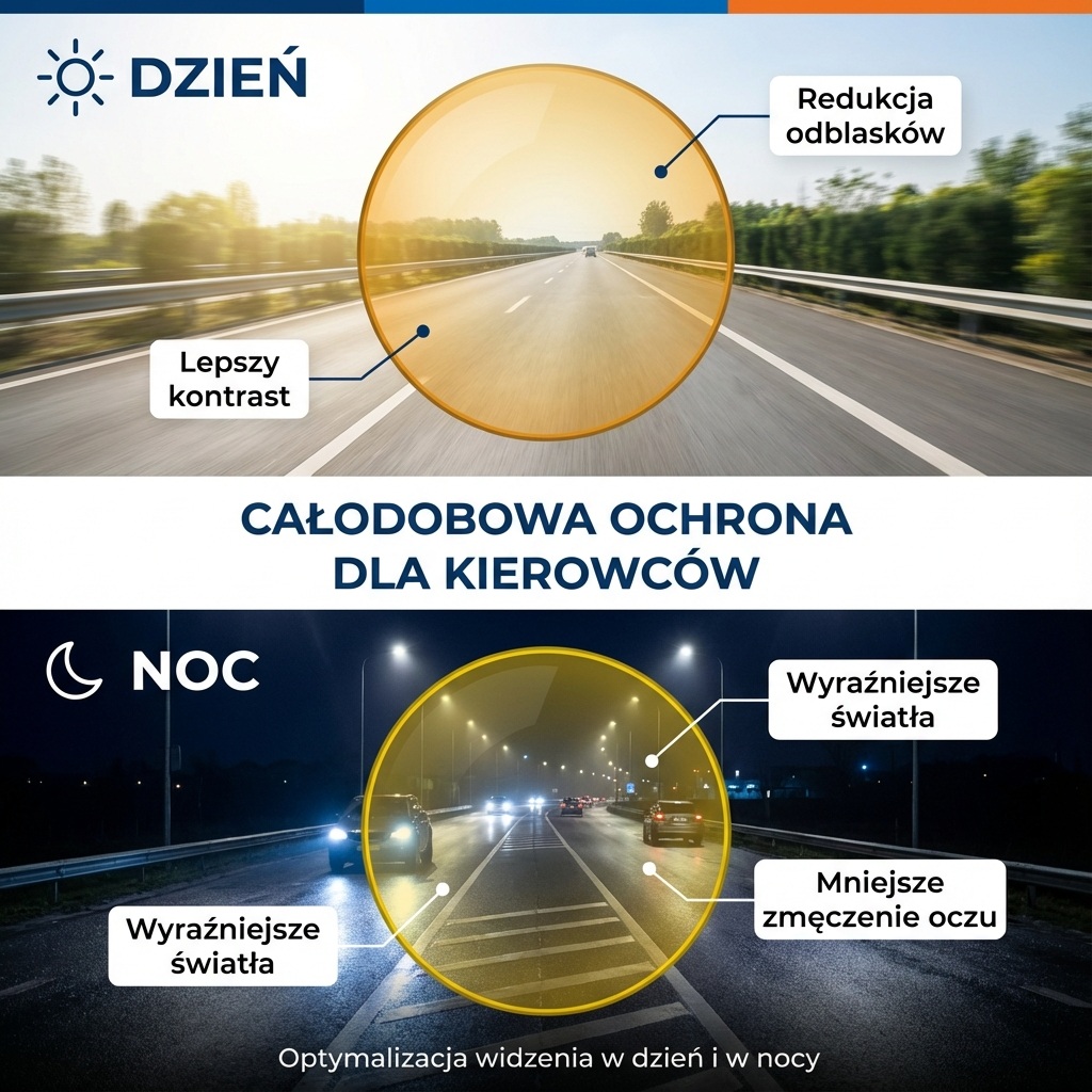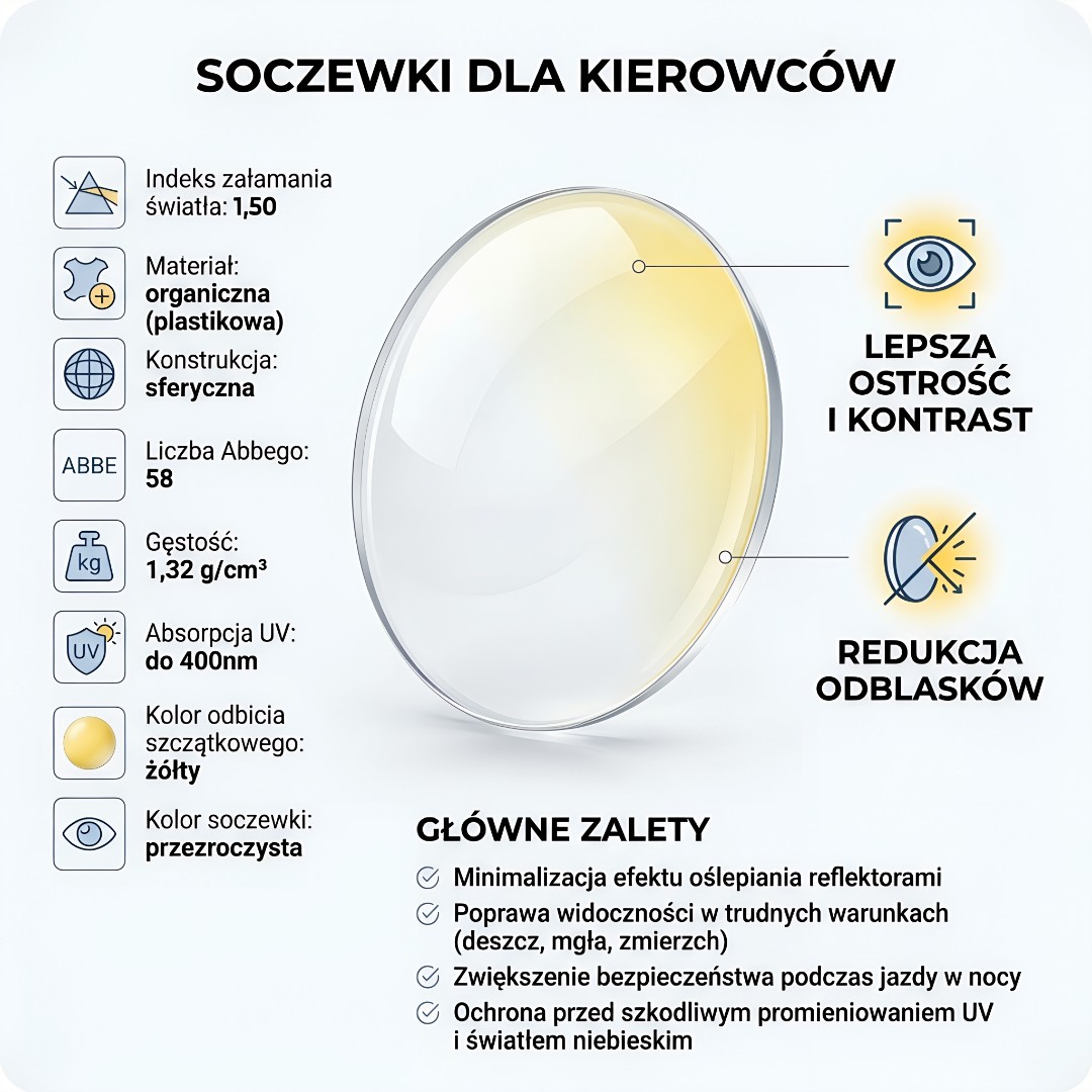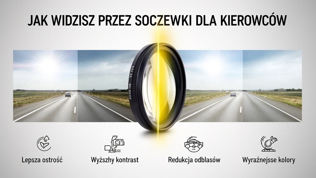 Soczewki poprawiają komfort prowadzenia, oferując lepszą ostrość, wyższy kontrast, redukcję refleksów oraz wyraźniejsze kolory. Zapewniają bardzo dobre widzenie zarówno w dzień, jak i w nocy, dzięki czemu możesz czuć się pewnie za kierownicą w różnych warunkach. Szczególnie po zmroku redukcja odblasków i poprawa kontrastu znacząco zwiększają wygodę jazdy.